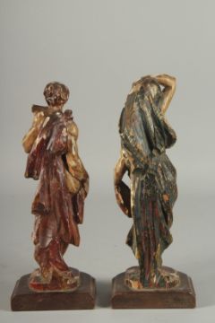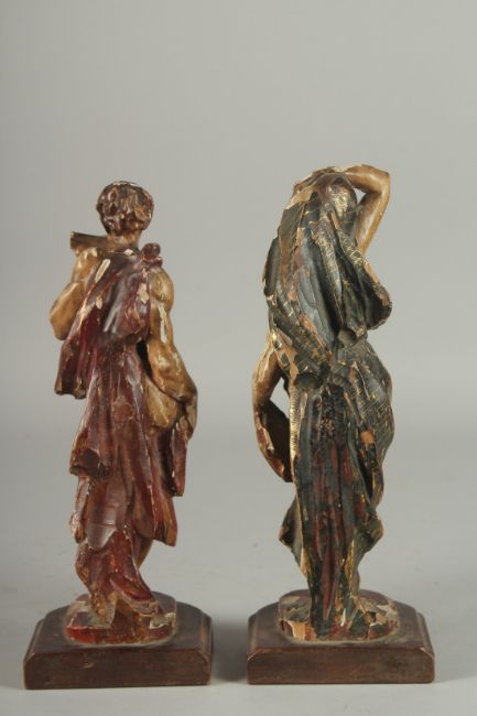 A GOOD PAIR OF 17TH - 18TH CENTURY CARVED AND POLYCHROMED WOOD FIGURES.