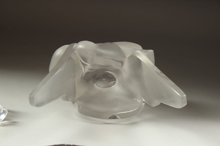 A FROSTED GLASS LALIQUE LOVE BIRD as a flower vase.