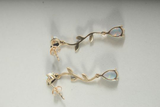 A GOOD PAIR OF 9CT GOLD, OPAL AND DIAMOND DROP EARRINGS, boxed.