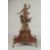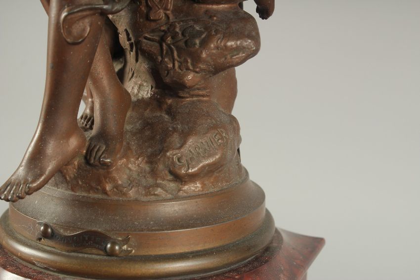 A 19TH CENTURY RED MARBLE AND SPELTER GROUP MANTLE CLOCK with key and pendulum.