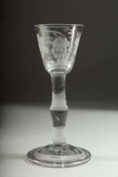 A GEORGIAN WINE GLASS with knop stem, the bowl engraved with fruiting vines.