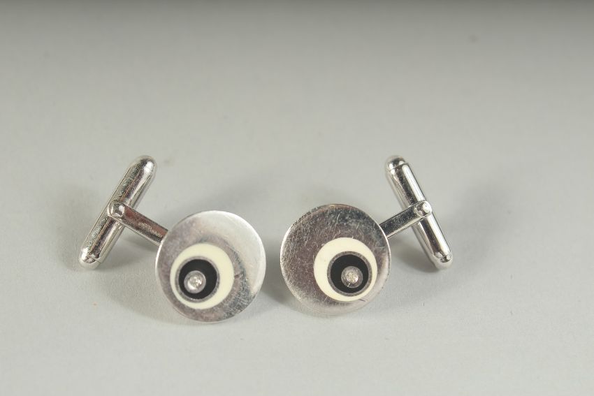 A PAIR OF SILVER, DIAMOND AND ENAMEL CUFFLINKS, boxed.