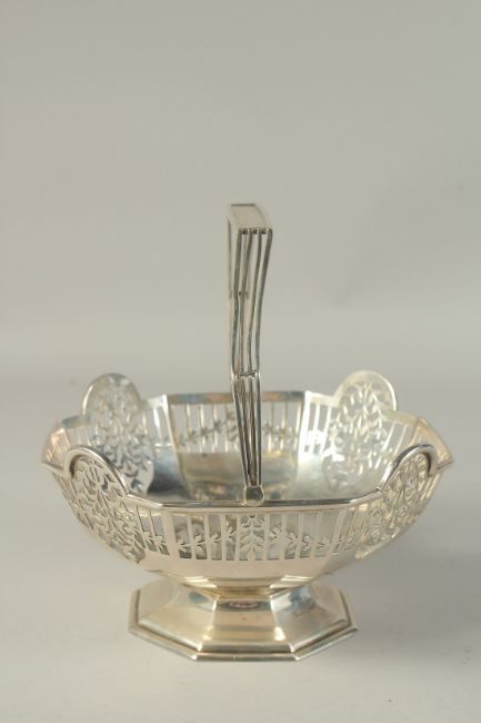 AN OCTAGONAL PIERCED SILVER BASKET with swing handle.