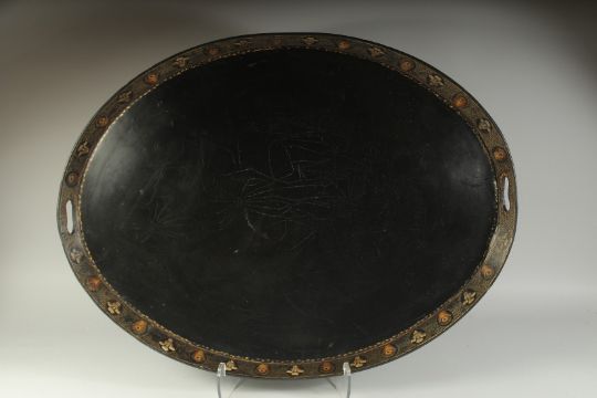 A SUPERB REGENCY PAPIER MACHE OVAL TWO HANDLED TEA TRAY, the border painted with Prince of Wales plumes and feathers.