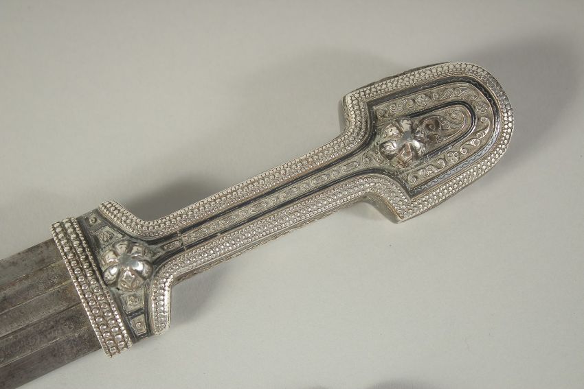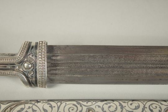 A VERY GOOD RUSSIAN SILVER HANDLE AND SHEATH DAGGER, dated 1894, with damask blade.
