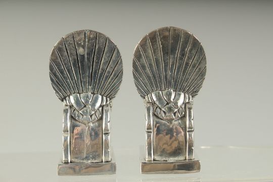 A PAIR OF SILVER PLATE TURKEY SALT AND PEPPERS.