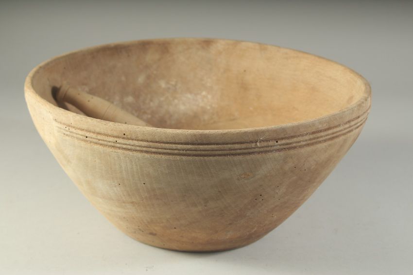 A LARGE WOODEN CIRCULAR BUTTER BOWL AND SPOON.