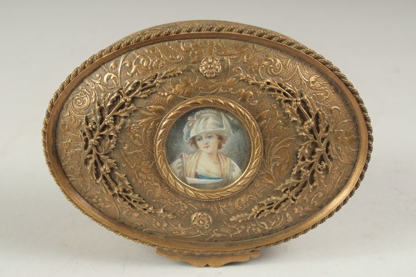 A GOOD 19TH CENTURY OVAL GILT METAL JEWEL BOX the lid inset with a miniature.