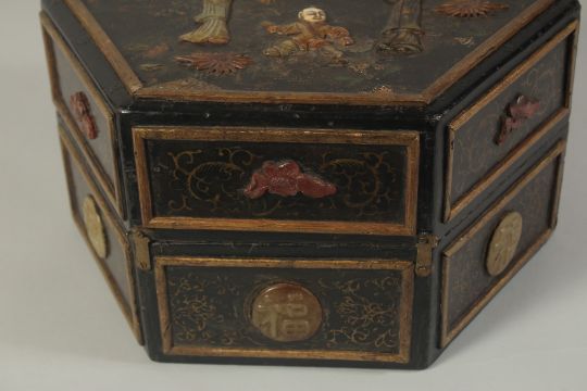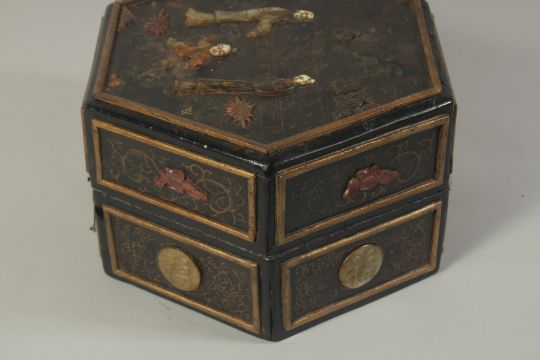 AN ORIENTAL BONE AND HARDSTONE INLAID WOODEN HEXAGONAL BOX, with decorative carved floral stones and character plaques, the lid depicting hardstone figures with carved bone faces, 31cm wide.