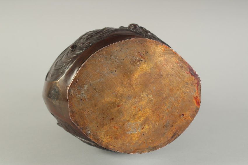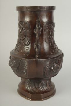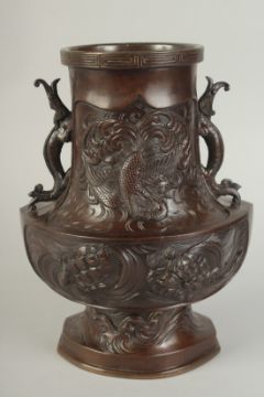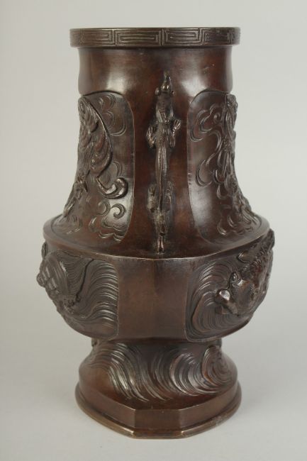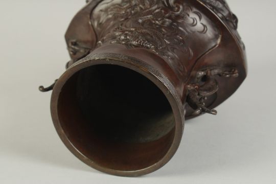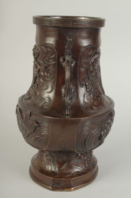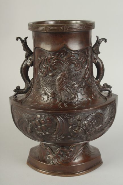 AN UNUSUAL BRONZE TWIN HANDLE DRAGON AND PHOENIX VASE, with panels of relief decoration including a large carp and minogame turtles, the handles formed as dragon-like beasts, 27.5cm high.