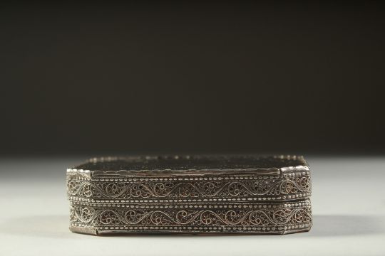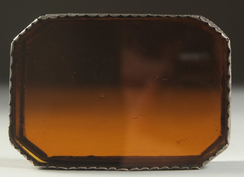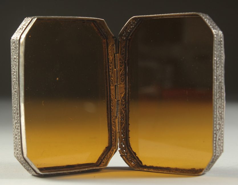 A FINE 18TH CENTURY INDO PORTEGUESE AMBER GLASS MOUNTED FILIGREE SILVER BOX, 10cm x 7cm x 2.5cm.
