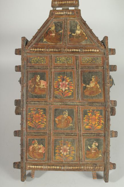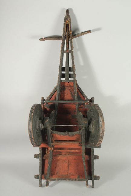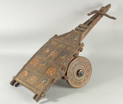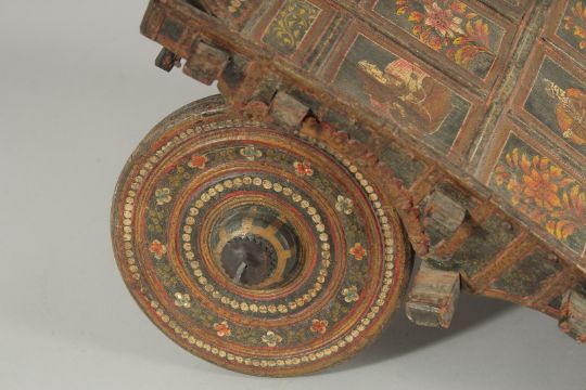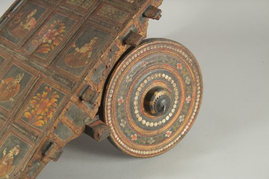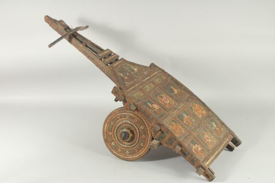 A 19TH CENTURY INDIAN KASHMIR MINIATURE CART, painted with panels of figures and decorative flora, 89cm long.