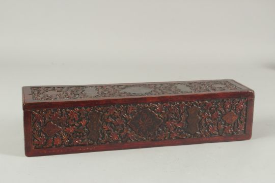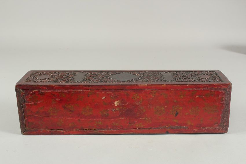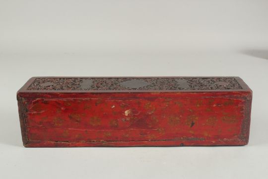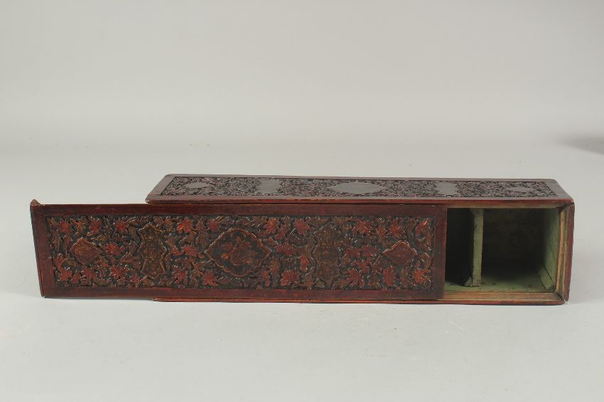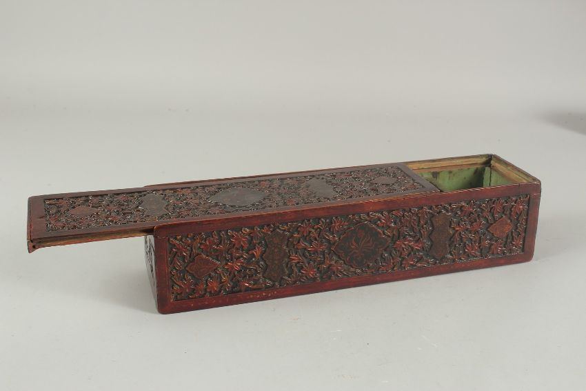 A RARE 18TH CENTURY MUGHAL INDIAN CARVED PAINTED AND LACQUERED WOODEN PEN BOX, 36cm x 9cm.