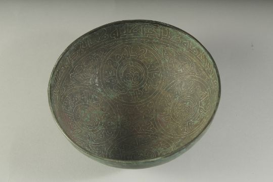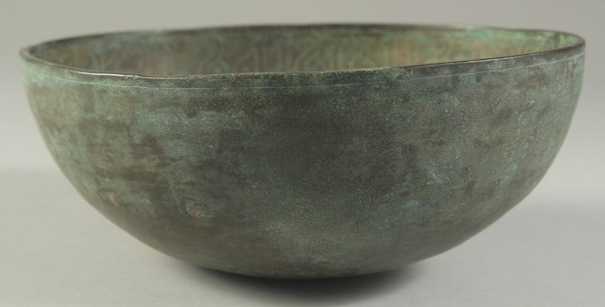 A RARE 10TH-11TH CENTURY PERSIAN GAZNAVID BRONZE BOWL, with fine Kufic calligraphy to the interior, 20cm diameter.