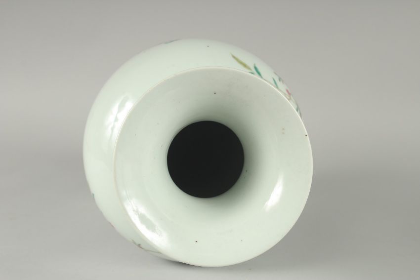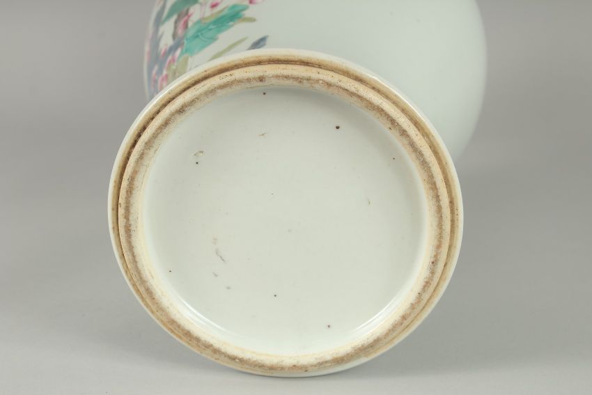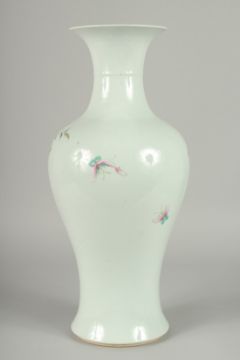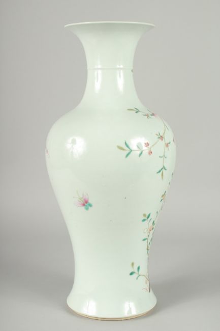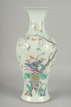 A LARGE CHINESE FAMILLE ROSE PORCELAIN BALUSTER VASE, painted with colourful enamels depicting birds beneath the branches of a blossoming peach tree with various flora and butterflies, 45cm high.