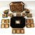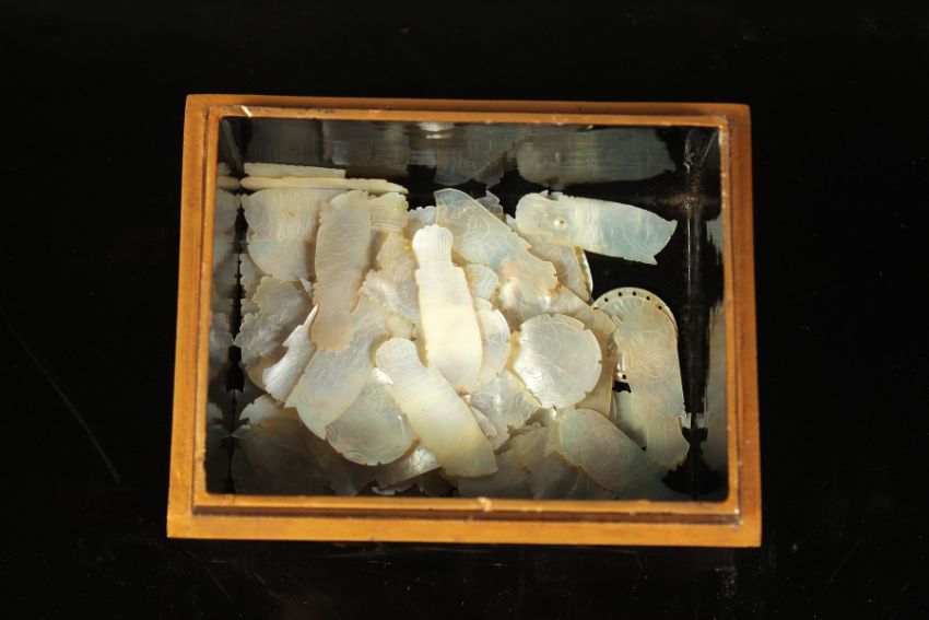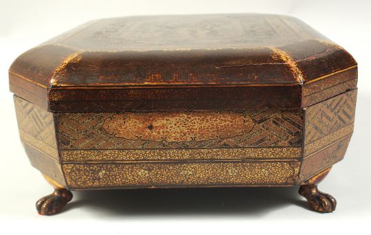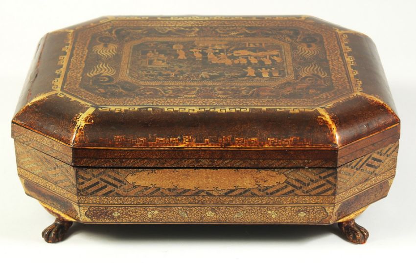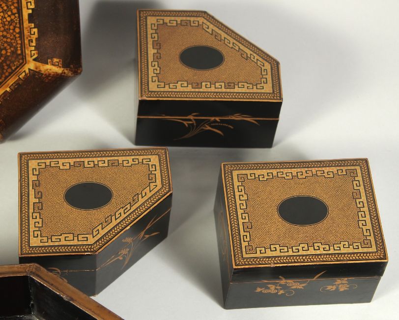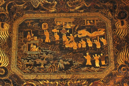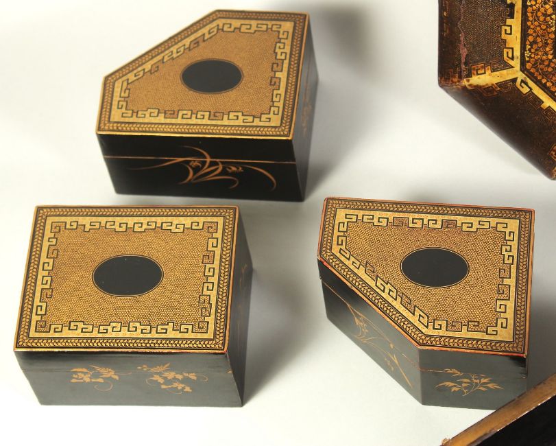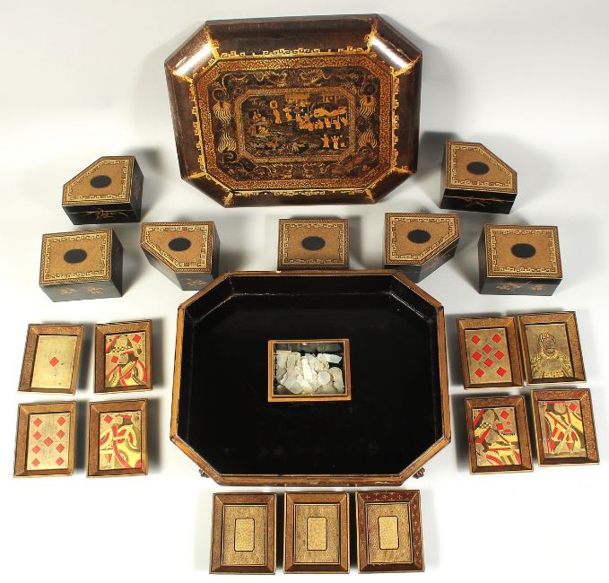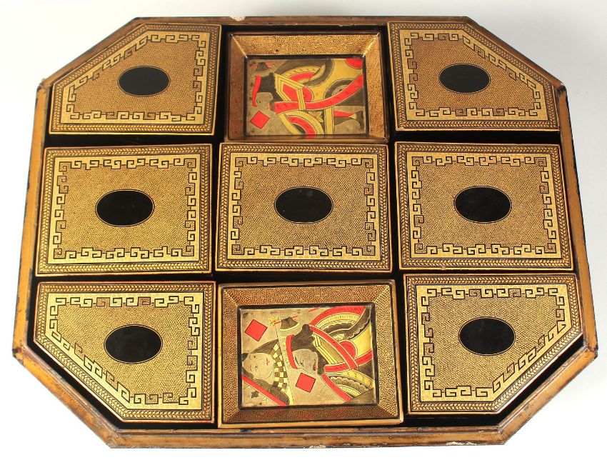 A CHINOSERIE BLACK AND GILT LACQUER GAMING BOX, containing lidded compartments and trays with mother of pearl gaming counters.