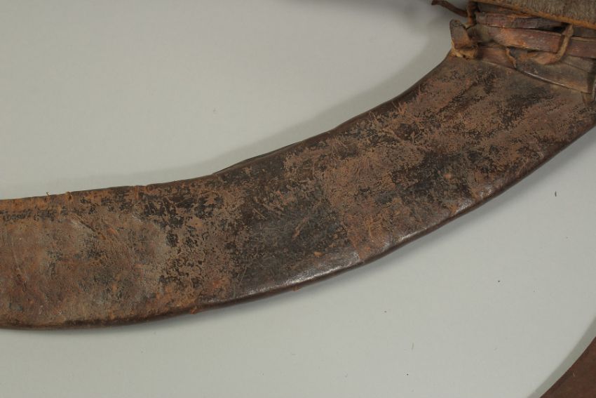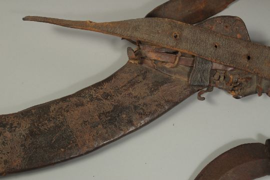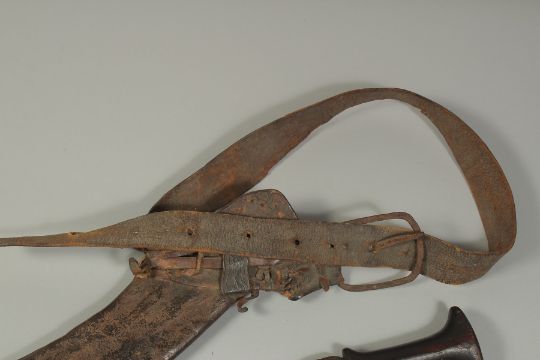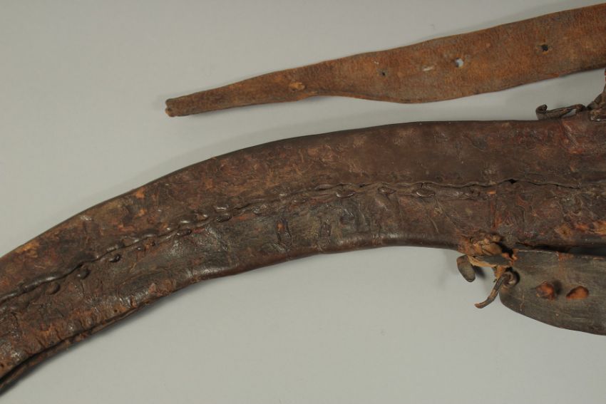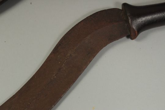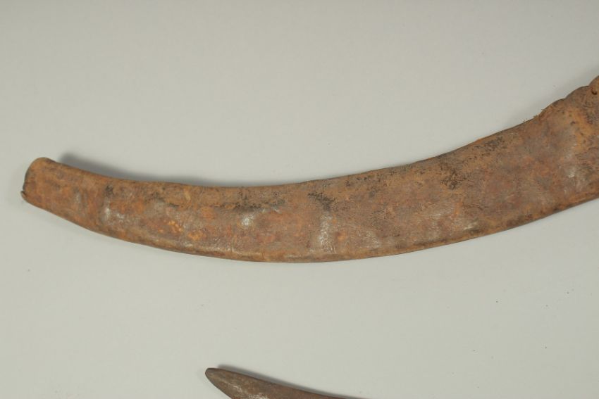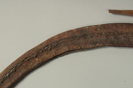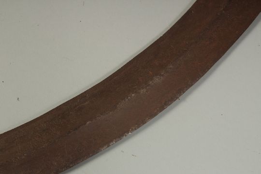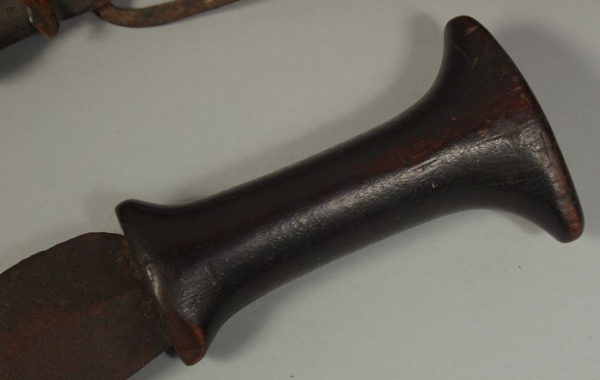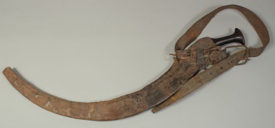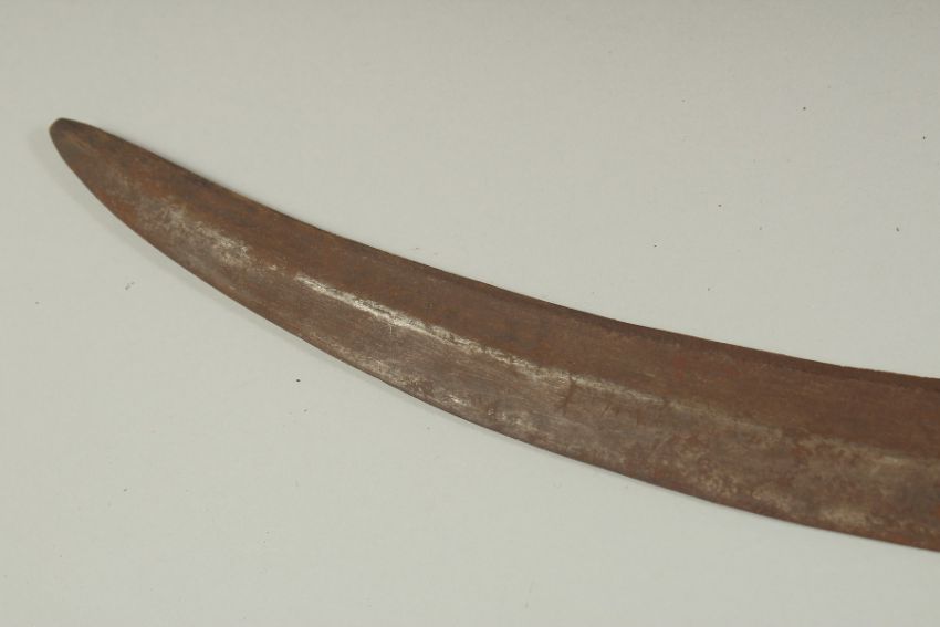 AN 18TH-19TH CENTURY ETHIOPIAN CURVING RHINO HORN HILTED SWORD, with scabbard, 74cm long overall.