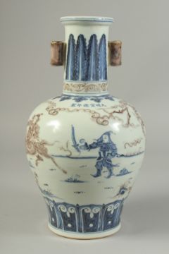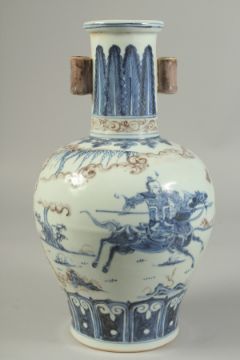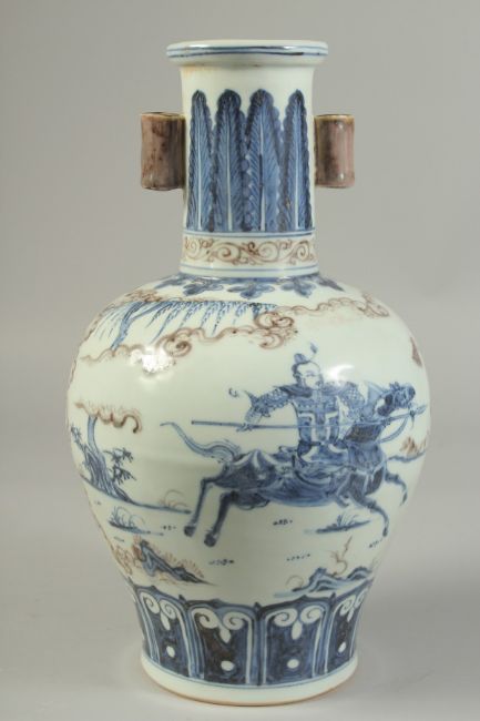 A CHINESE BLUE, WHITE AND UNDERGLAZE RED PORCELAIN VASE, with warriors on horseback, 32cm high.