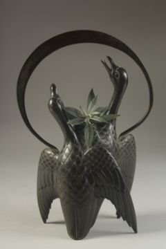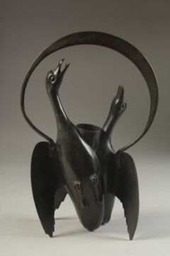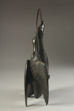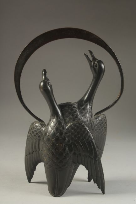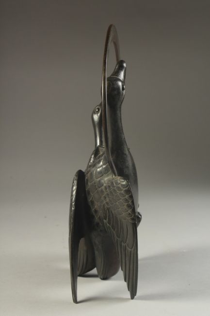 AN UNUSUAL JAPANESE MEIJI BRONZE 'GEESE' VASE, with overarching handle above the vase, formed as two geese in flight with traces of gilt to the feathers, 29cm high.