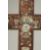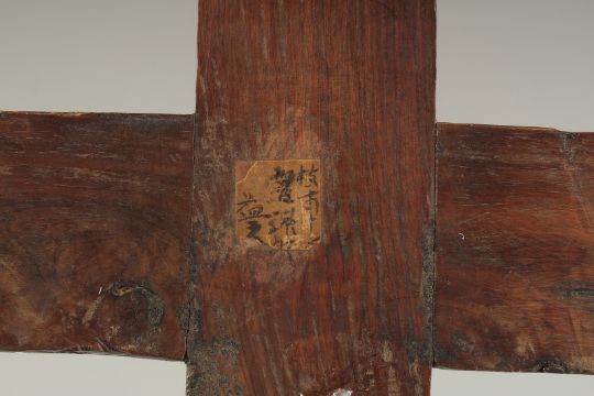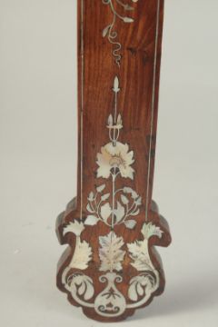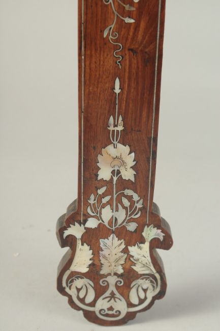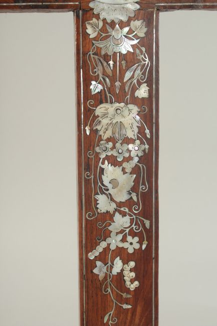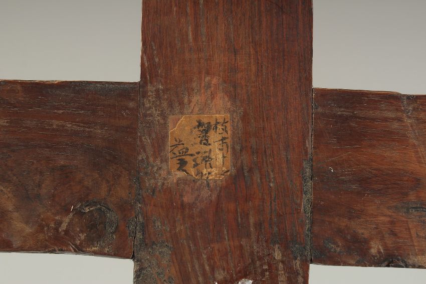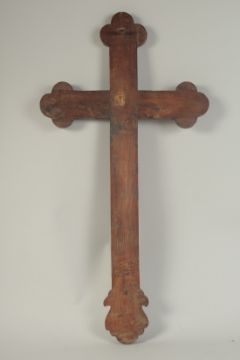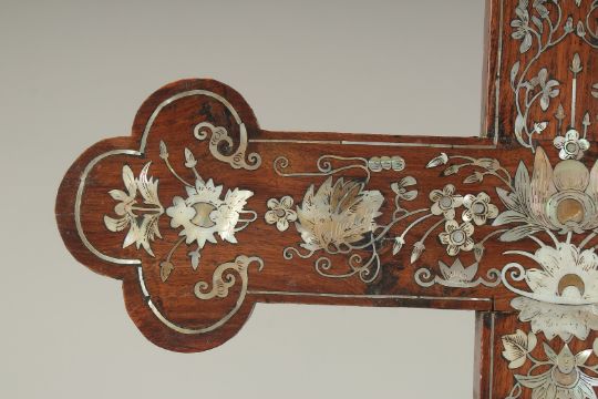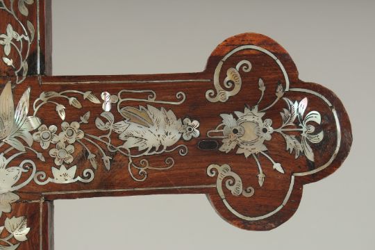 AN 18TH-19TH CENTURY CHINESE MOTHER OF PEARL INLAID WOODEN CROSS, designed with central lotus and further decorated with floral motifs, the reverse with hanging peg, 54cm x 28cm.