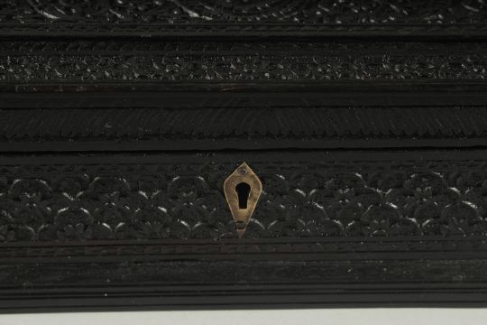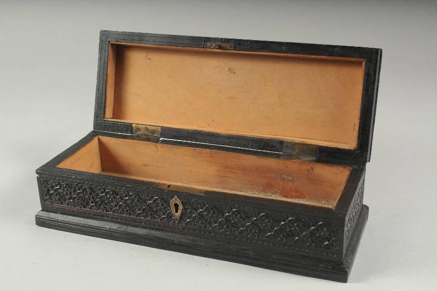 A FINE MID 19TH CENTURY ANGLO INDIAN CARVED EBONY BOX, 39.5cm x 11.5cm.
