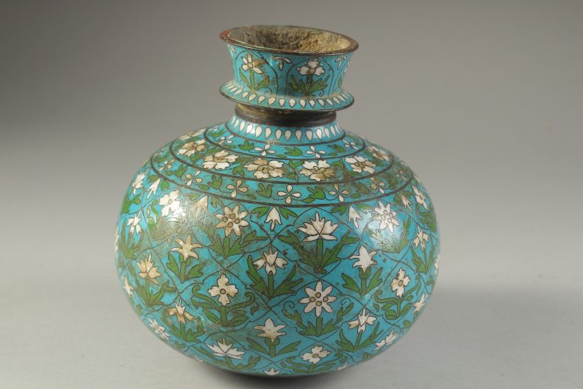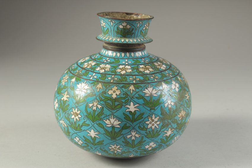 A FINE CHINESE OR JAPANESE CLOISONNE HUQQA BASE, made for the Islamic market, 16cm high.