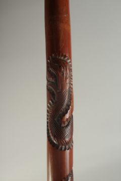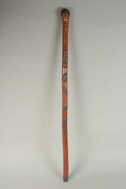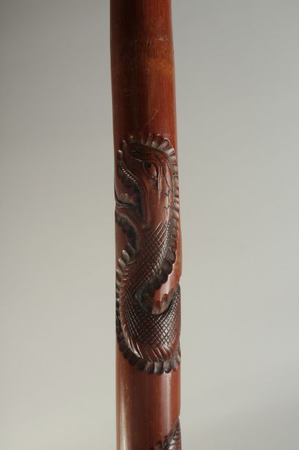 A CHINESE BAMBOO WALKING STICK, carved with snake, 89cm long.