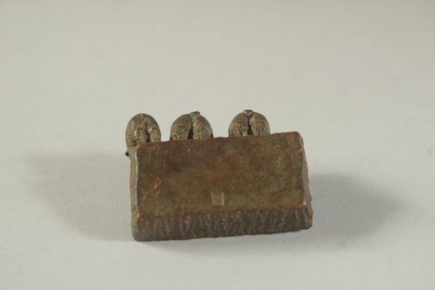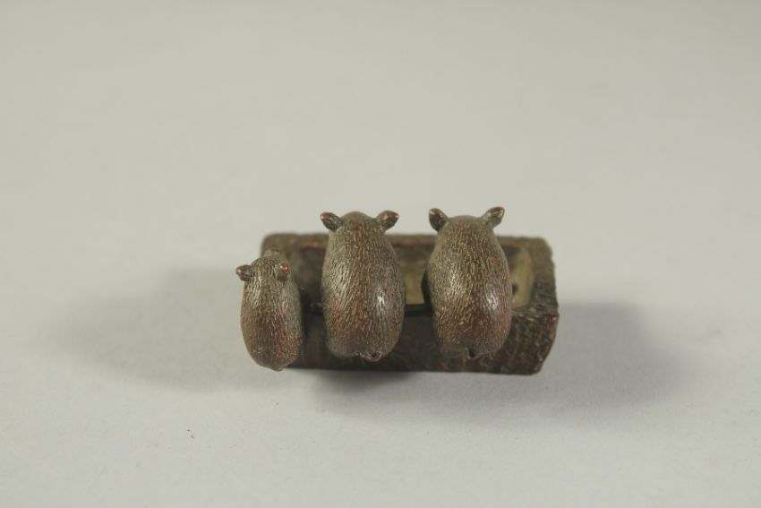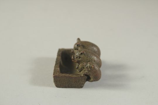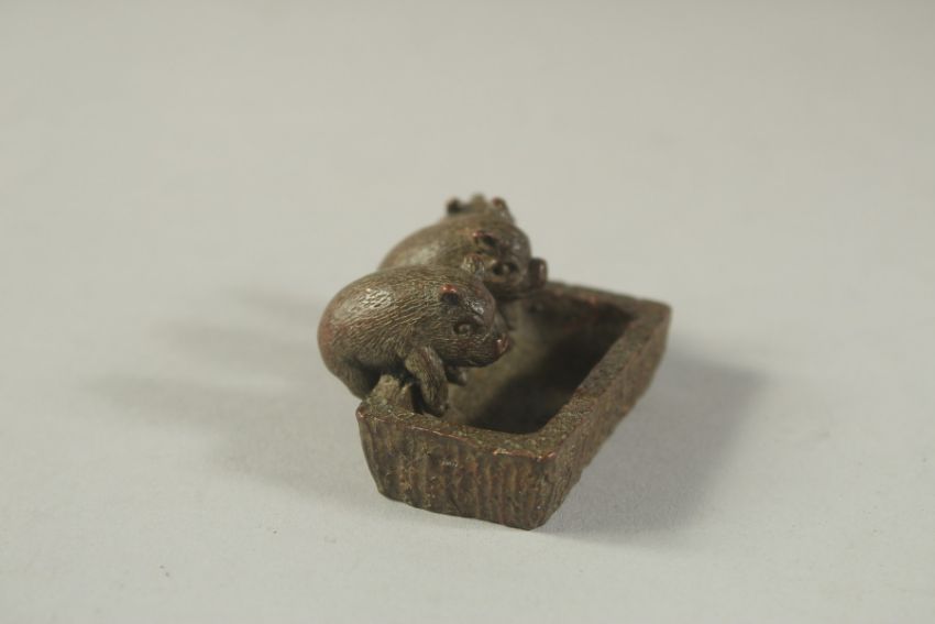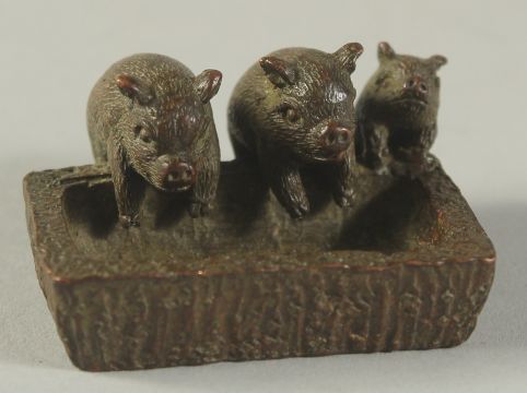 A BRONZE OKIMONO OF PIGLETS AT A TROUGH, 5cm wide.