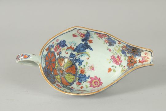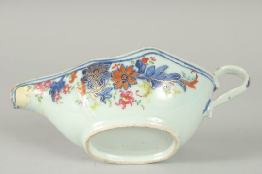A FAMILLE ROSE PORCELAIN SAUCE BOAT, with gilt highlights, (af), 21cm long.
