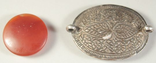 A FINE 19TH CENTURY INDIAN ENGRAVED AGATE AMULET, with silver backing, along with another engraved agate seal, (2).