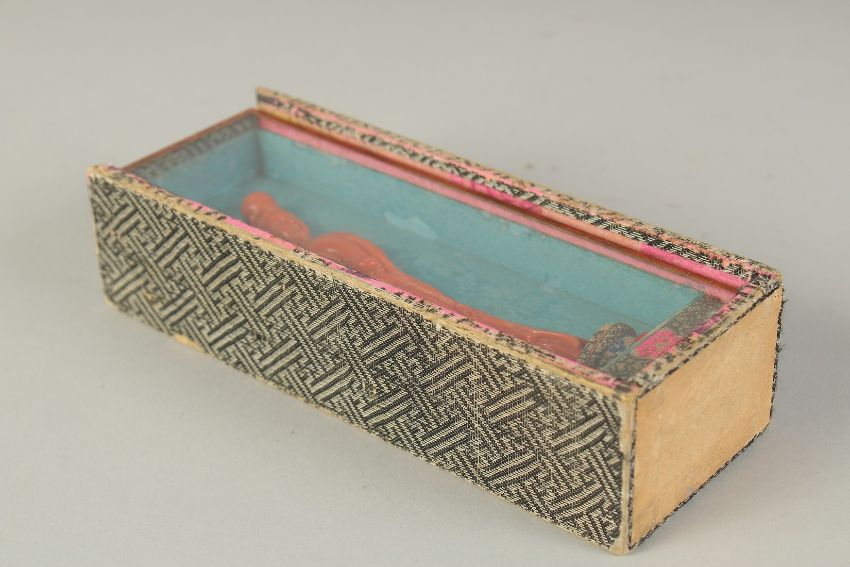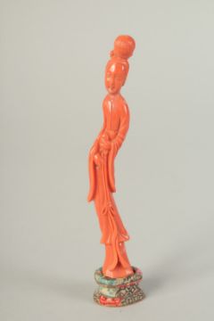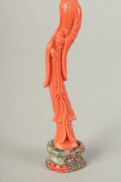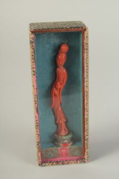 A VERY FINE CHINESE CARVED CORAL FIGURE OF GUANYIN, on stand and in original fitted box with sliding glass protector, coral figure 12cm high.