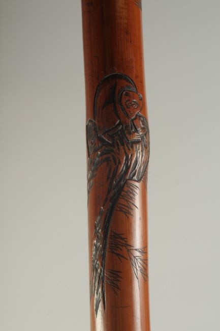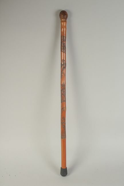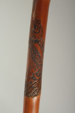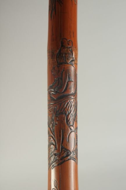 A CHINESE BAMBOO WALKING STICK, carved with monkeys, 75cm long.