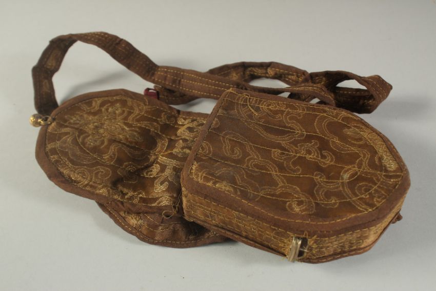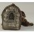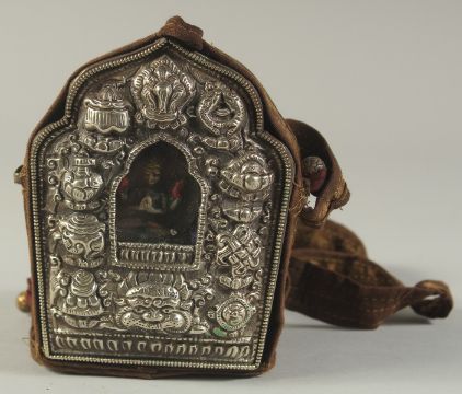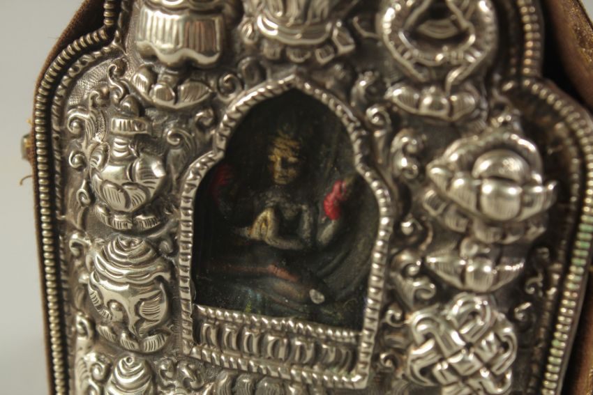 A TIBETAN TRAVELLING BUDDHA SHRINE, with embossed silver depicting lucky symbols, encased with small buddha, 13cm x 10cm.