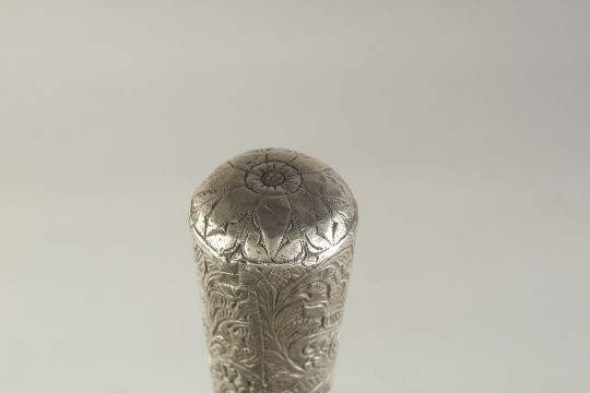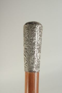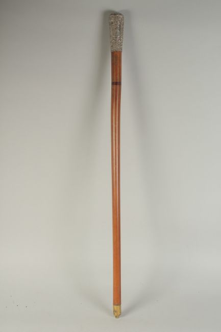 A CHINESE WOODEN WALKING STICK WITH EMBOSSED SILVER TOP, 86cm long.