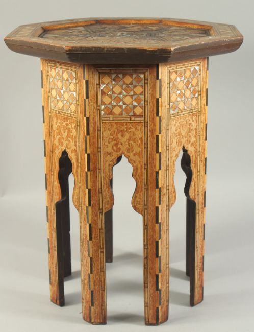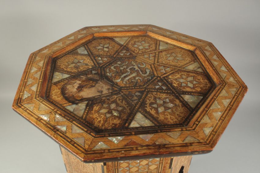 A 19TH CENTURY SYRIAN MOTHER OF PEARL AND INLAID WOODEN OCTAGONAL TABLE, the table top with central calligraphic panel, 52.5cm high, table top 44.5cm at widest point.