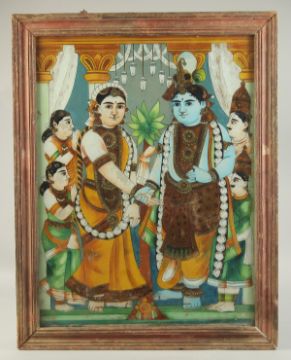 A LARGE LATE 19TH CENTURY SOUTH INDIAN TANJORE REVERSE PAINTING ON GLASS, depicting Krishna and Radha, framed, image 61cm x 45cm.