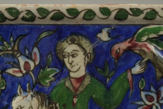 A PERSIAN QAJAR GLAZED POTTERY TILE, with a figure on horseback holding a bird aloft, 22cm x 16cm.