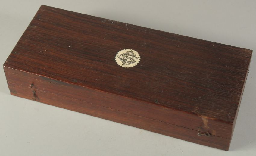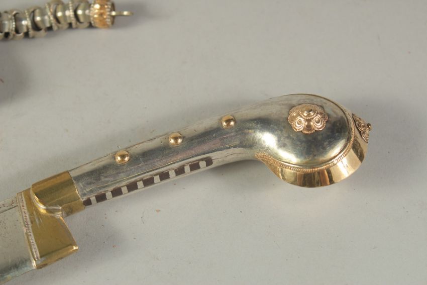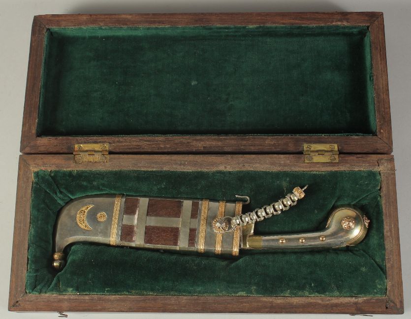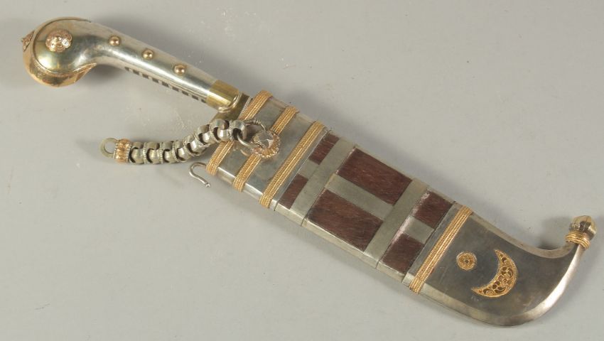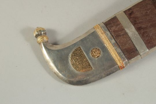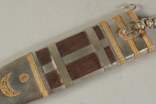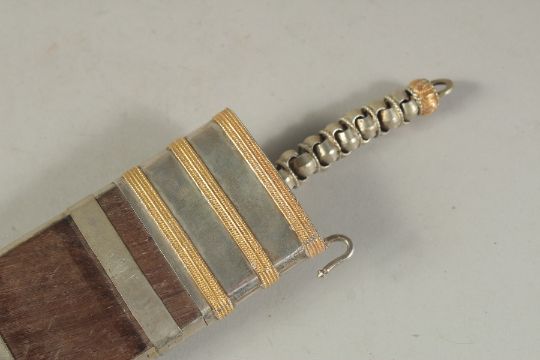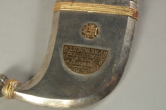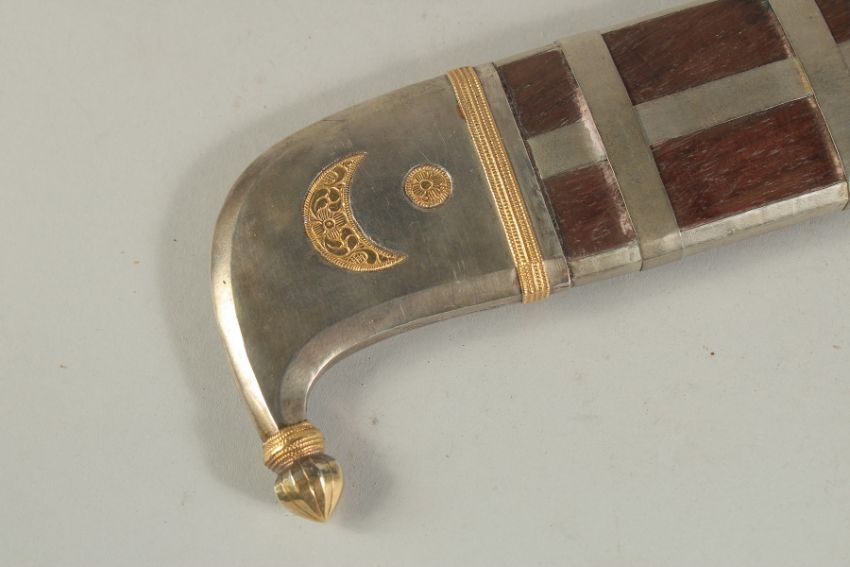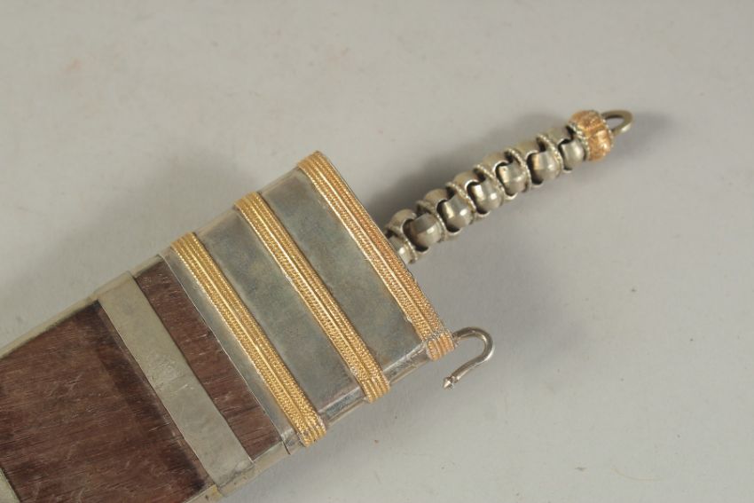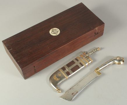 A RARE LATE 19TH-EARLY 20TH CENTURY WOODEN CASED SILVER AND GOLD MOUNTED INDIAN COORG PICHANGATTI DAGGER, presented to H.C. Bennette, Coorg Forest sports club president, 29cm long.Please note:  This item contains ivory (small ivory inset to the box). We ask that you please make yourself aware of the laws regarding importing ivory into your country before bidding. Submission reference: V9KC6629 : *this registration expires when the owner changes. You must reapply if you wish to resell this item*