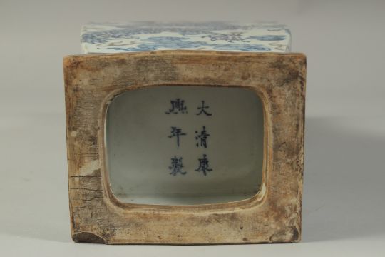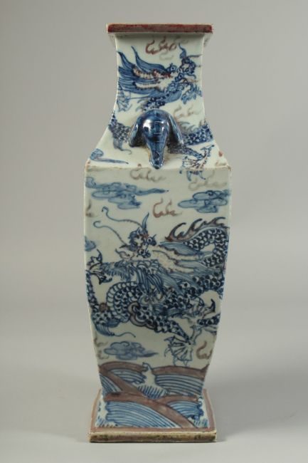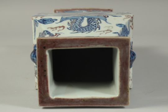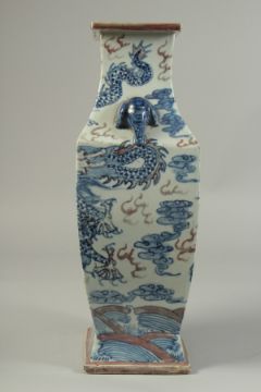 A CHINESE BLUE, WHITE AND UNDERGLAZE RED PORCELAIN SQUARE FORM DRAGON VASE, with moulded twin handles, 36cm high.