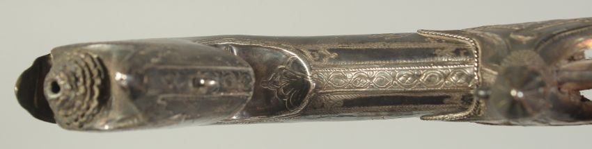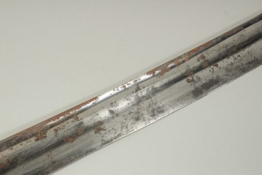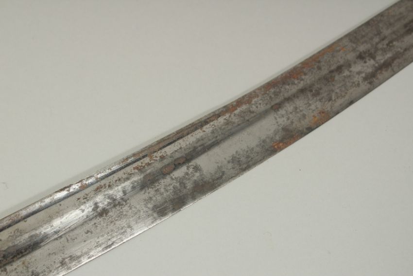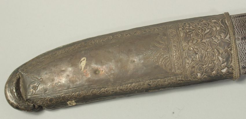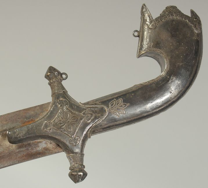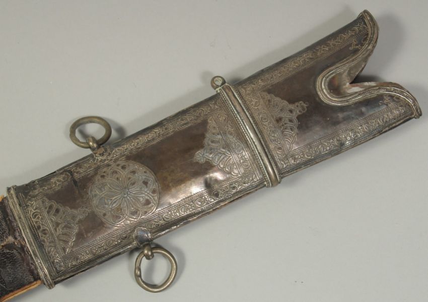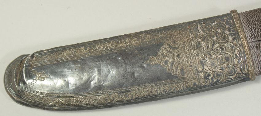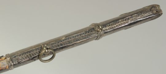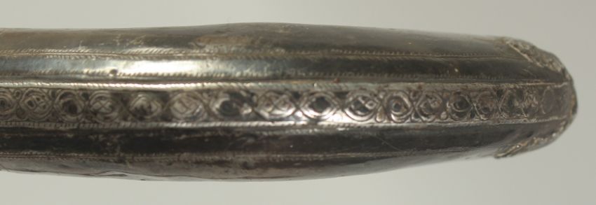 A RARE EARLY 19TH CENTURY ARAB YEMENI SILVER MOUNTED SWORD, with leather overlaid wooden scabbard, 90cm long overall.