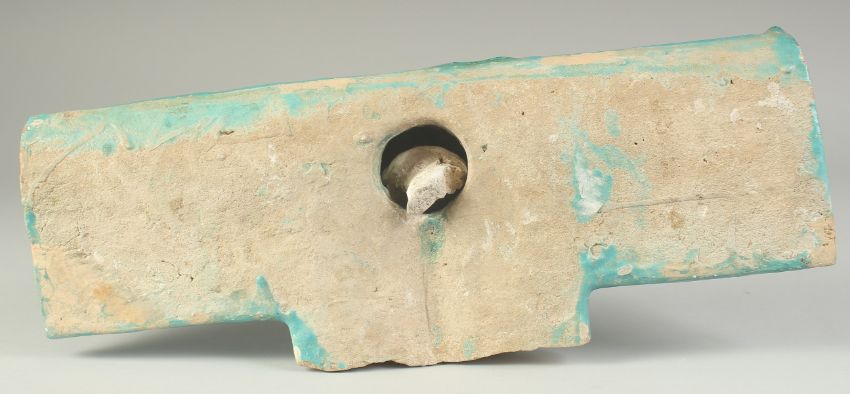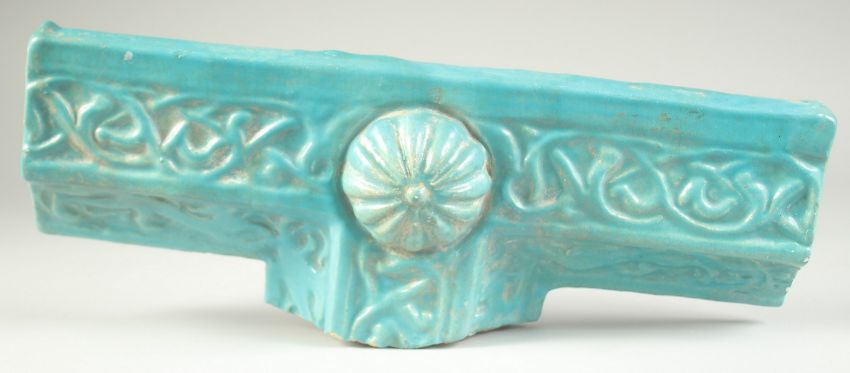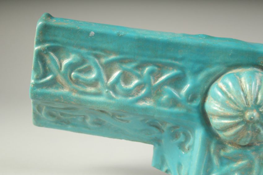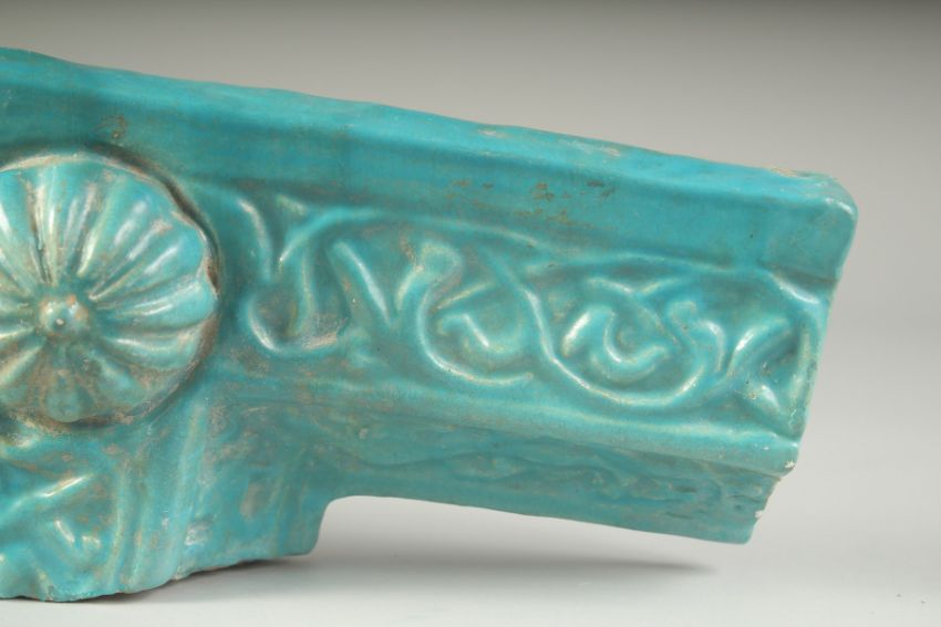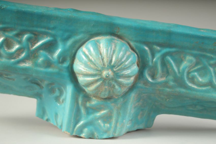 A FINE AND LARGE 12TH-13TH CENTURY PERSIAN KASHAN TURQUOISE GLAZED BORDER TILE, with animals and Arabesque decoration, 41cm long.