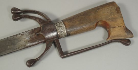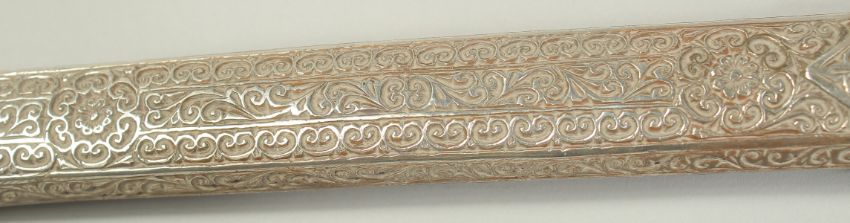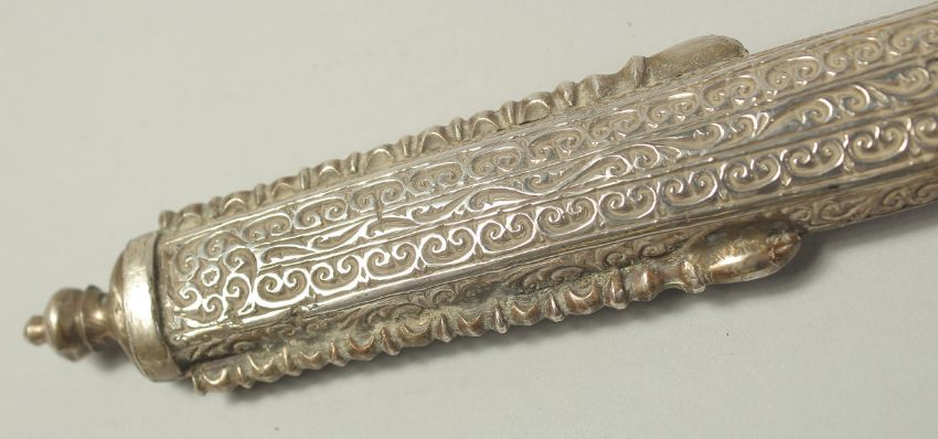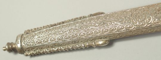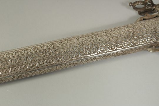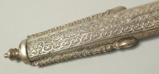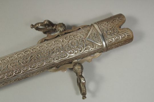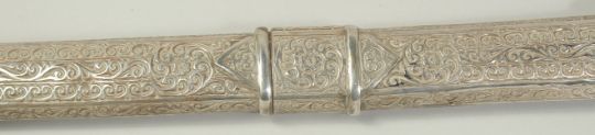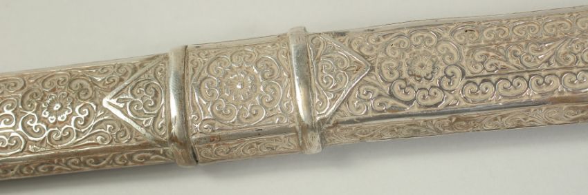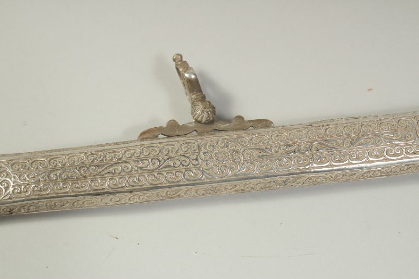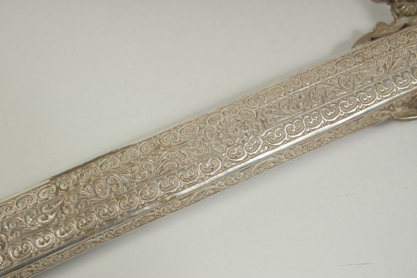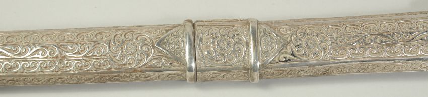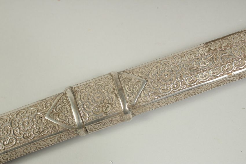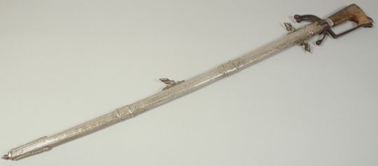A VERY FINE 19TH CENTURY MOROCCAN RHINO HORN HILTED NIMCHA SWORD, with engraved silver scabbard, 100cm long overall.