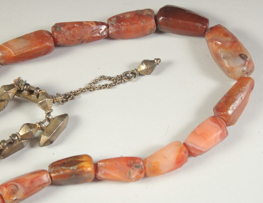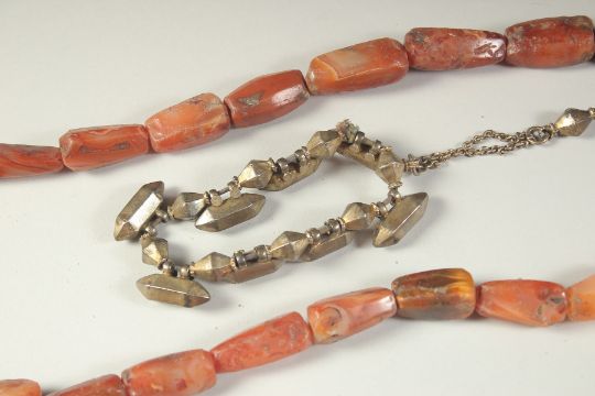 A POSSIBLY ANCIENT AGATE BEADED NECKLACE, along with a Mughal Indian gilt metal bracelet, with possibly small amulet cases, (2).