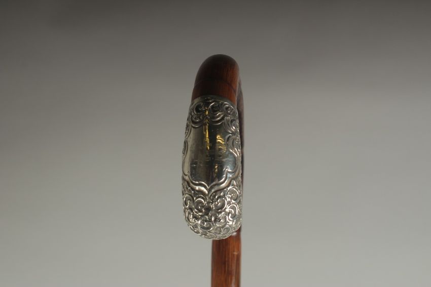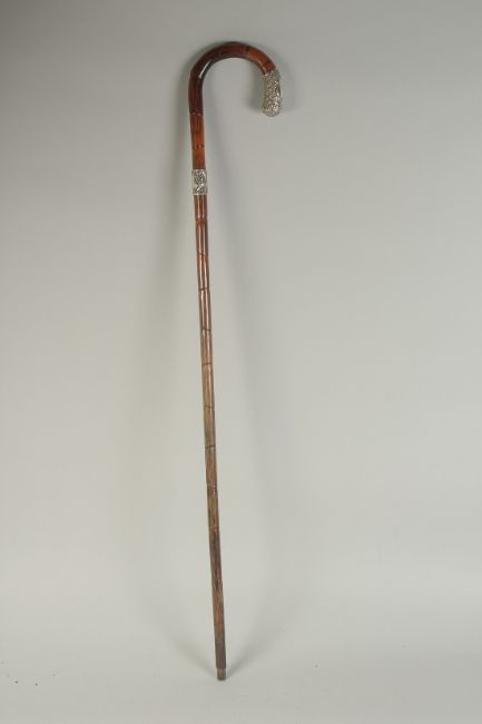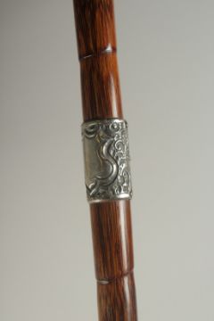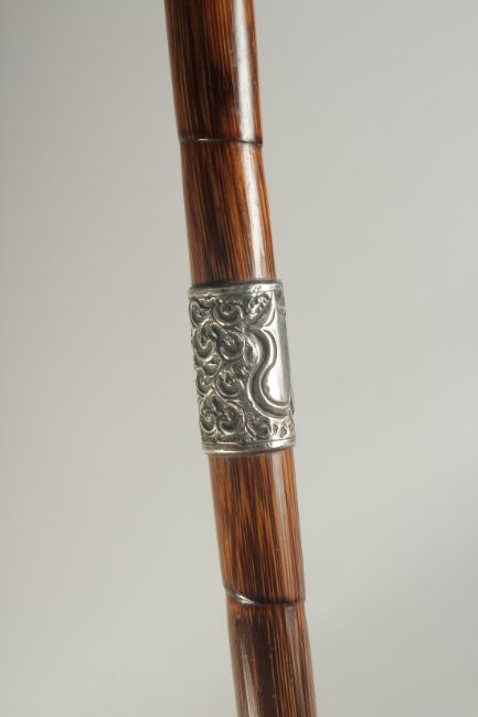 A CHINESE BAMBOO WALKING STICK, with embossed silver mounts, inscribed 'H.E.B', 86cm long.