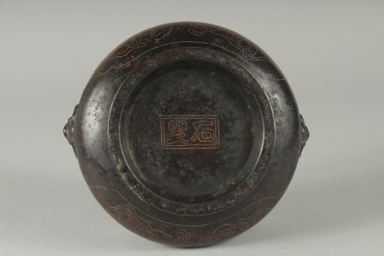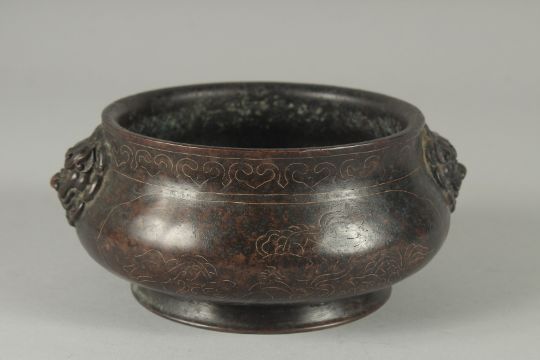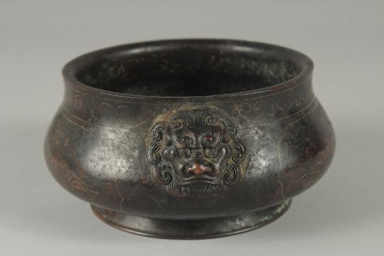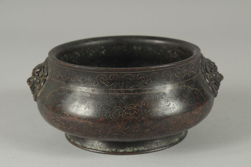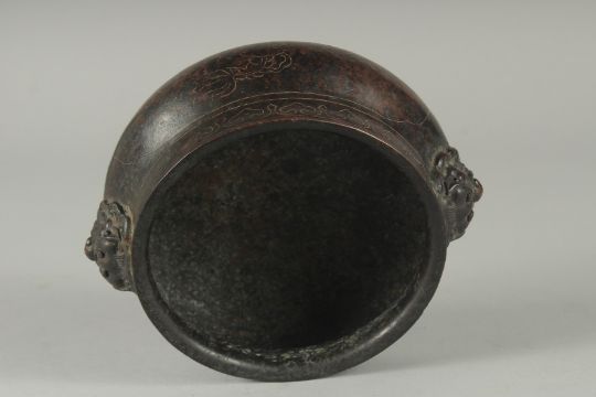 A 19TH / 20TH CENTURY CHINESE WIRE INLAID HEAVY BRONZE CENSER, with relief lion head handles, 17cm wide (handle to handle).
