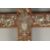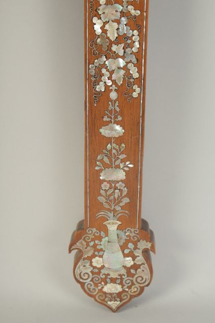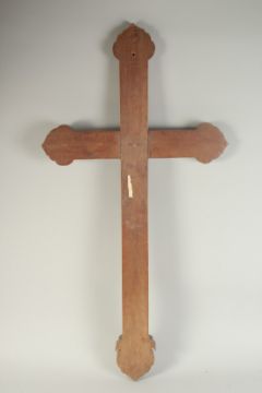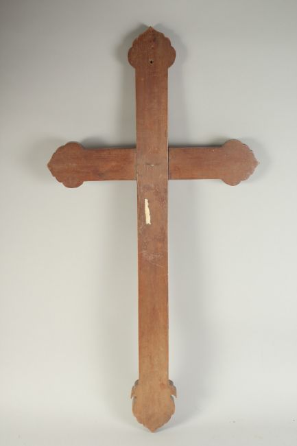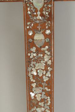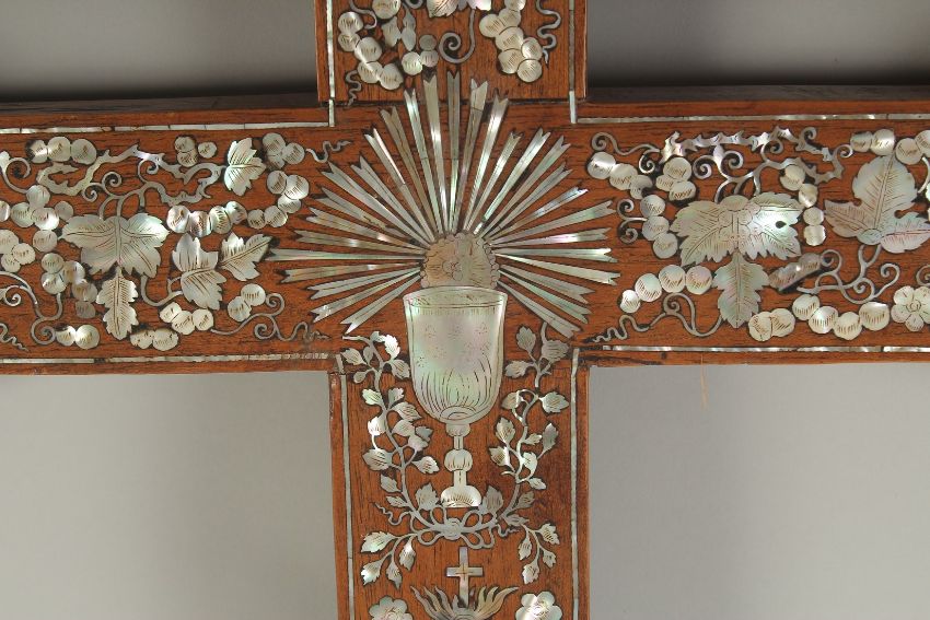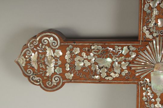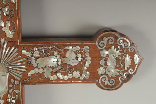 A VERY LARGE 18TH-19TH CENTURY CHINESE MOTHER OF PEARL INLAID WOODEN CROSS, decorated with central chalice and inlaid all over with fruiting blossom designs, the reverse with hanging peg, 84cm x 42cm.