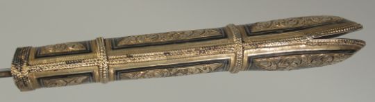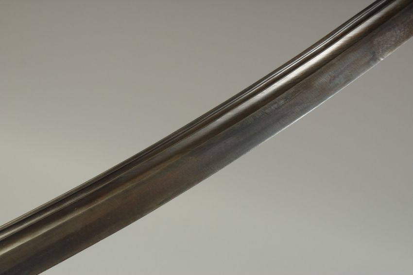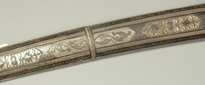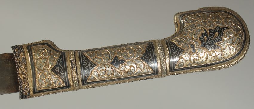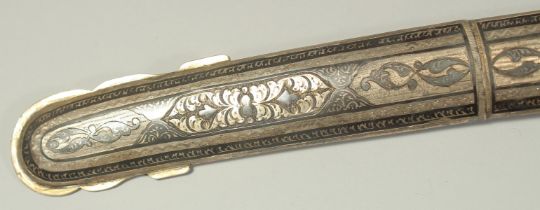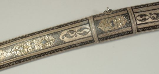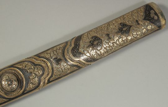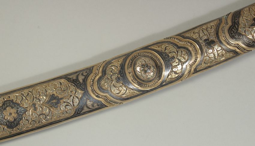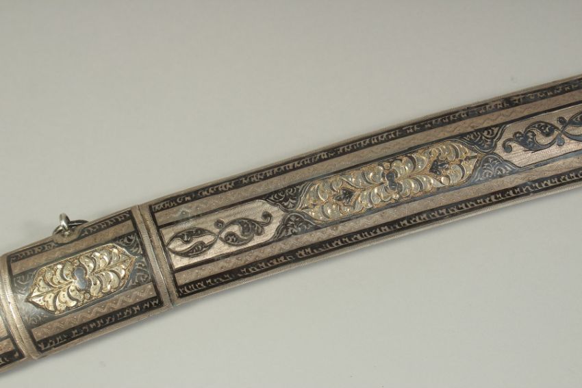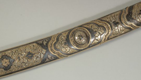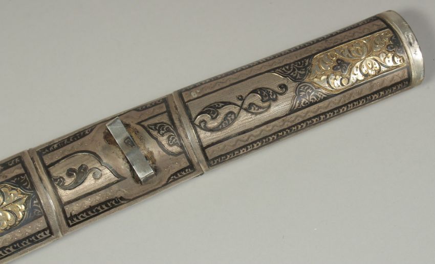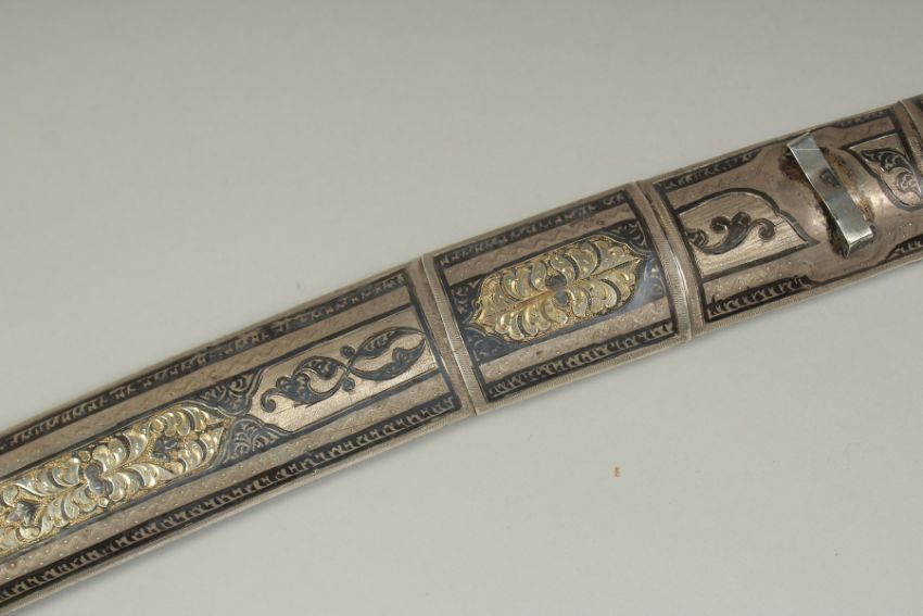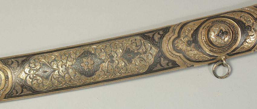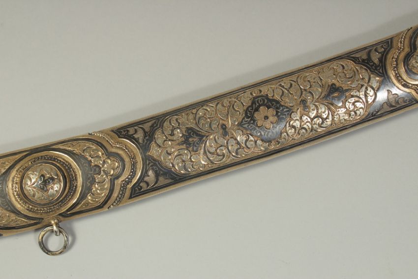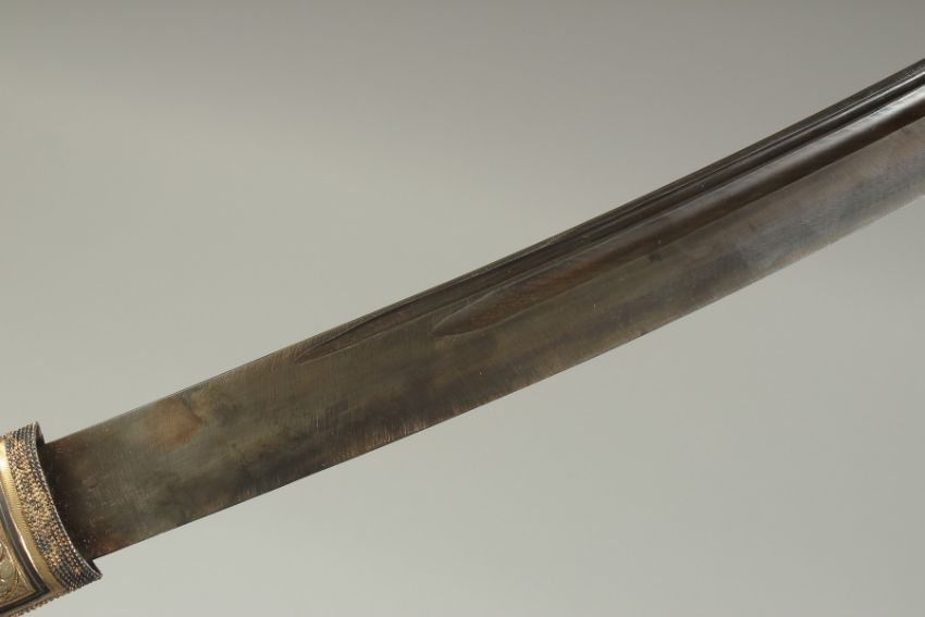 A VERY FINE 19TH - EARLY 20TH CENTURY CAUCASIAN NIELLO AND SILVER GILT SHASHKA SWORD, 94cm long overall.