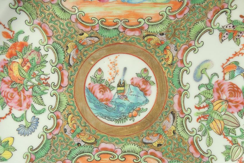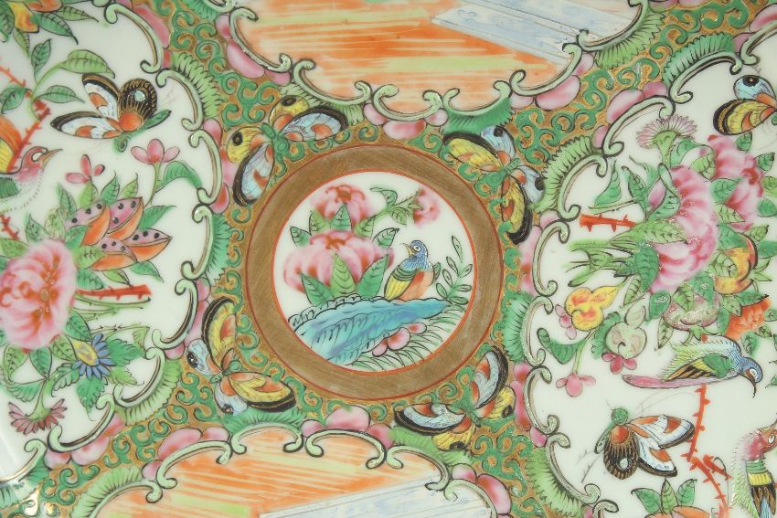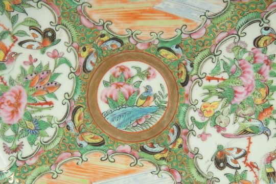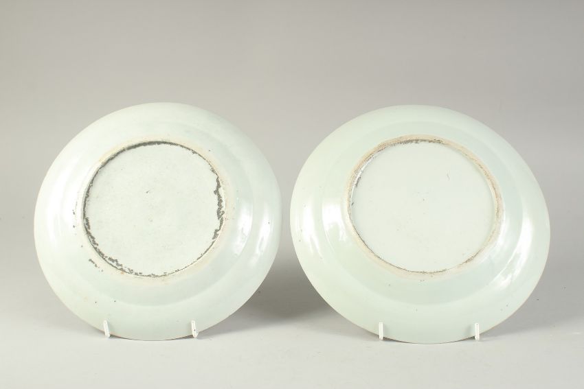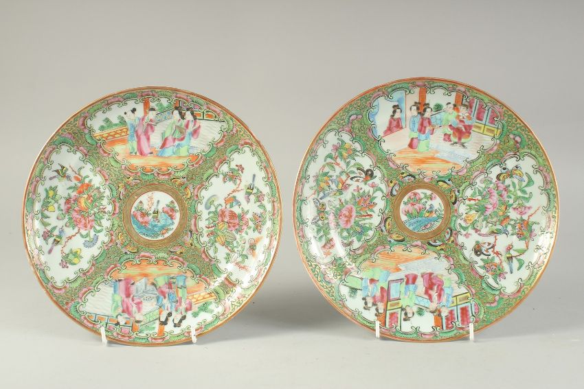 A PAIR OF CHINESE CANTON FAMILLE ROSE PORCELAIN PLATES, painted with panels of figures, birds and flora, further embellished with gilt highlights, 24.5cm diameter.