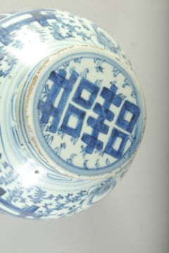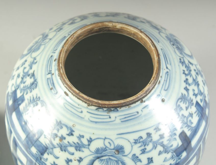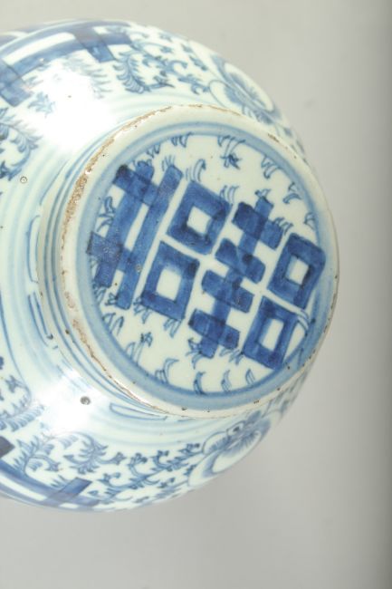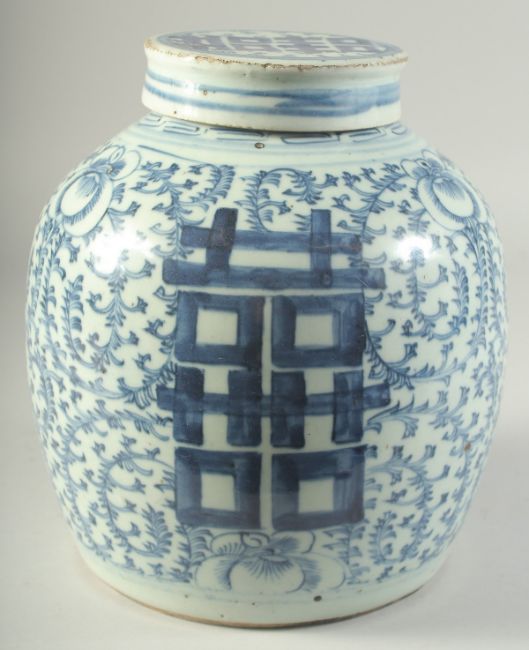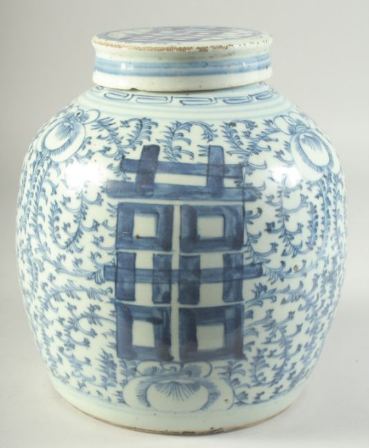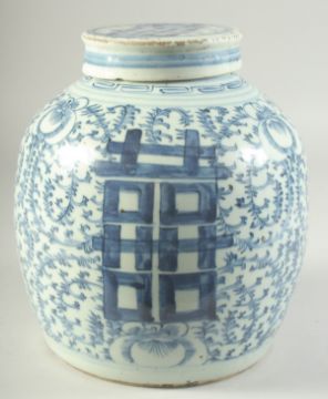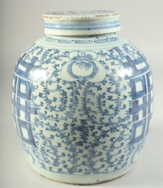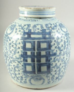 A CHINESE BLUE AND WHITE PORCELAIN GINGER JAR AND COVER, with 'double happiness' symbol and further decorated with scrolling vines, 23cm high.