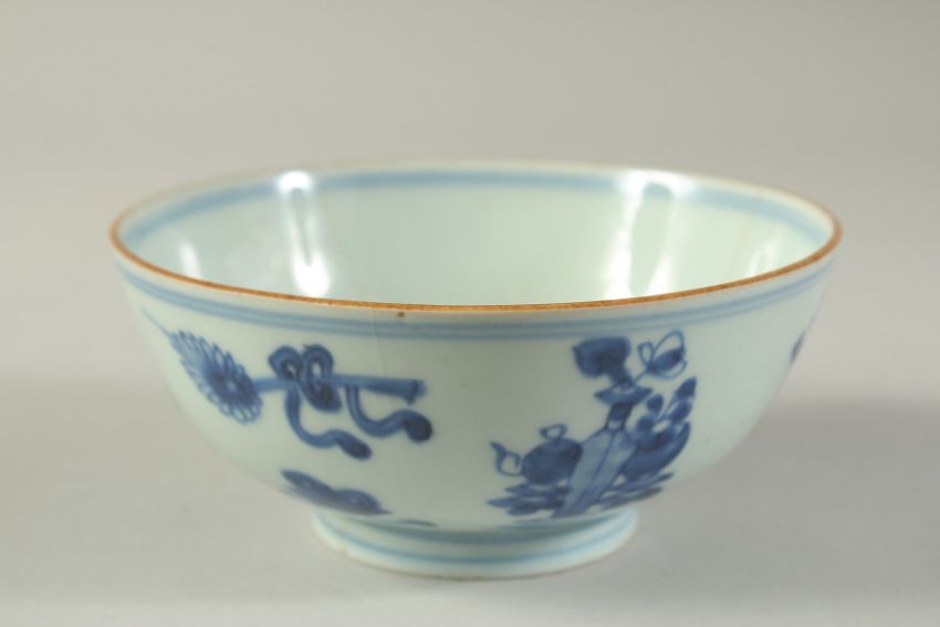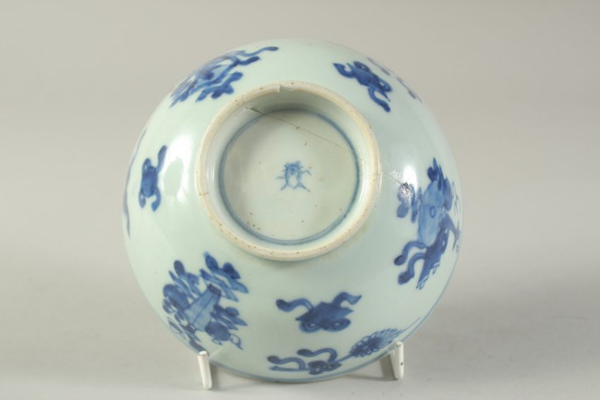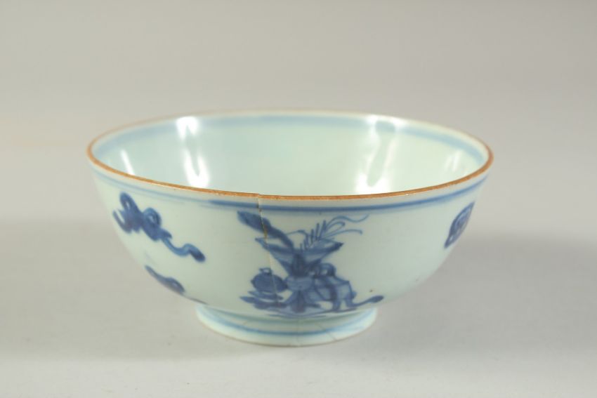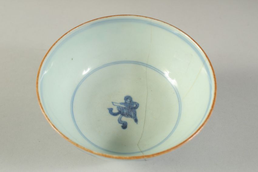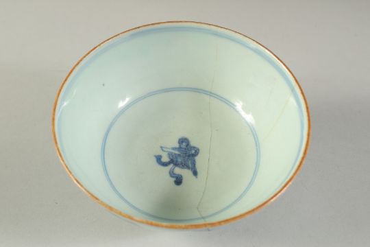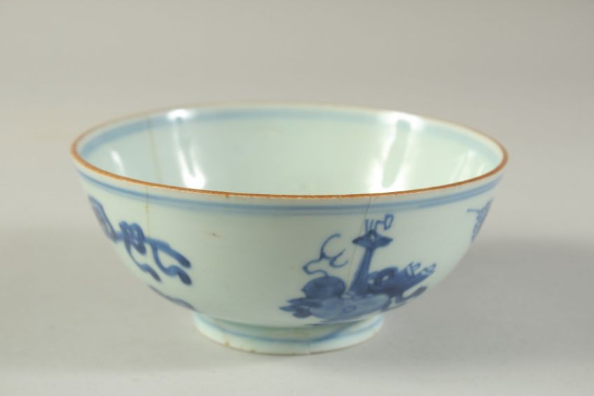 A CHINESE BLUE AND WHITE PORCELAIN BOWL, (af), 14.5cm diameter.